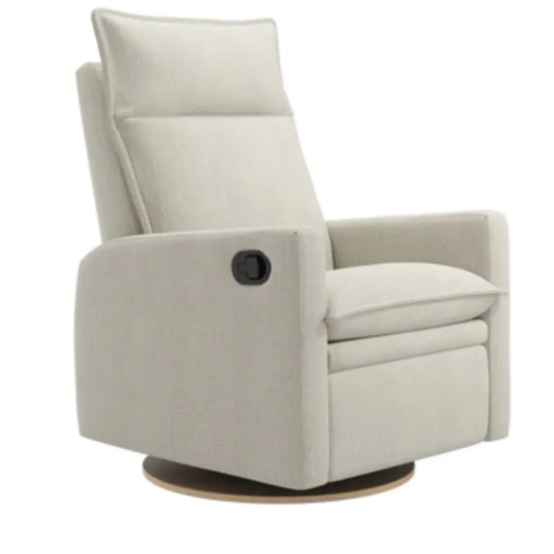 The new Arya recliner chair, swivel glider with removable cushions offers baby’s rooms a sleek, relaxed, and comfortable style with plush cushions, which allow you to sink into the chair to find the ideal relaxing position.