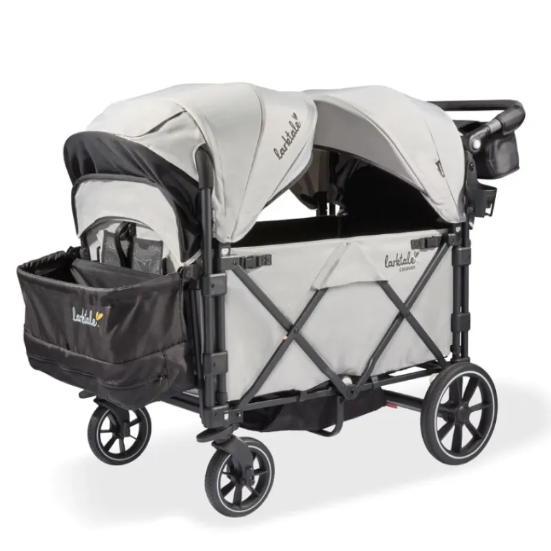 The Larktale Caravan Quad Stroller Wagon offers spacious seating for up to four passengers with multi-position reclining seats, a drop-down footwell, and a reconfigurable harness system for added versatility. With large rubber wheels, all-wheel suspension, ample storage, and adjustable sun canopies, it’s built for smooth maneuverability, comfort, and convenience on any adventure.