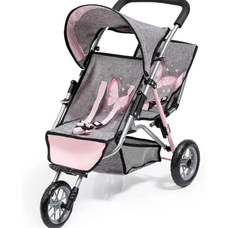 This fashionable Bayer Design Duo Twin 3 Wheeled Doll’s Stroller has a modern design. Its three-wheeled frame gives the twin jogger its sporty appearance. You can fit dolls with a size up to 18 inches in each seat Thanks to the integrated seat belts, your favourite dolls can always be securely buckled. The soft handle is also comfortable when pushing the stroller. For transportation reasons or to save storage space, the twin doll’s stroller can be folded. Furthermore the integrated shopping basket offers space for all necessary doll’s accessories.