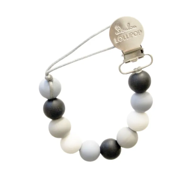 Loulou Lollipop’s fun and colorful silicone pacifier clips are constructed with twelve 15mm food grade silicone beads. The entire clip measures 10″ including the loop. They grow with baby from newborn to toddler!