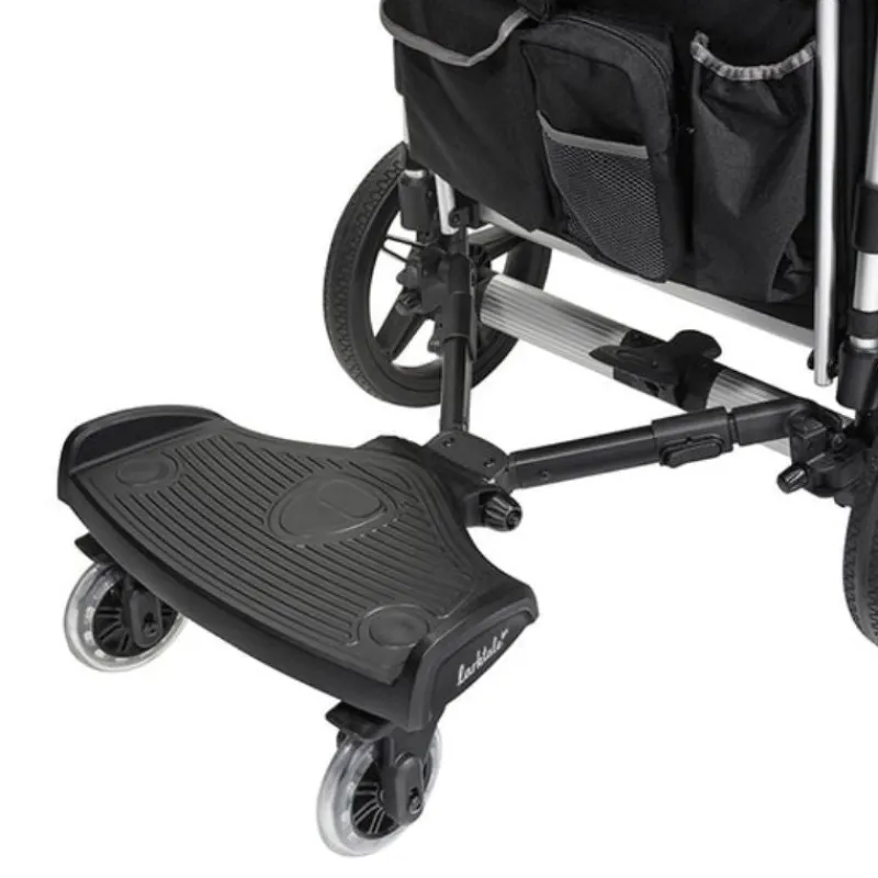 Hop-on Kiddo! Works with most stroller brands! Your growing toddler can ride along in safety and style with the Larktale Universal Ride-Along Stroller Board. Attaches to the rear of your stroller or stroller/wagon and provides a safe and comfortable spot for your tired toddler to ride along while staying within reach.Â