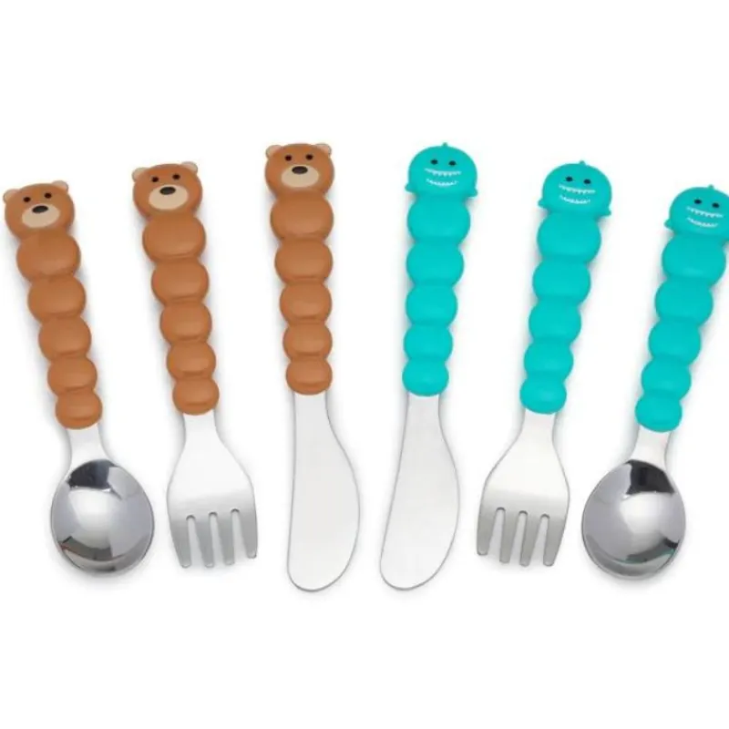 - rColorful bulldog, cat, shark and bear spoon and fork sets make feeding fun!r