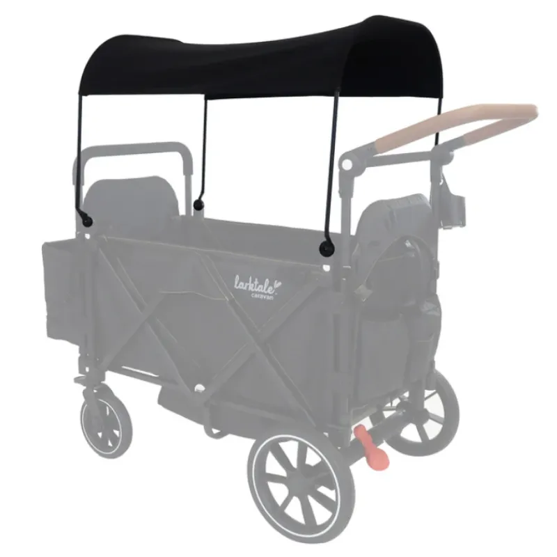 Folds with the caravan for easy storage and transportation! The Sun Topper offers caravan users an easy-to-use flexible sun shade option when the caravan’s standard full-coverage sun canopies aren’t needed. This innovative accessory snaps into the existing sun canopy brackets of your caravan to provide an adjustable fabric sun shield that can be positioned as needed against the sun’s rays. Its open-air design provides ample airflow and unrestricted visibility into the wagon so you can always keep an eye on your seated kids. When you’re ready to pack up and go, only the caravan sun topper folds with your stroller/wagon. Simply fold the caravan, shift the Sun Topper fabric off to the side, rotate the Sun Topper frame backwards until it’s flush against the folded caravan and you’re set to go. With the Sun Topper, you can swap out your full-coverage sun canopy set for a light-coverage option with high visibility, giving you even more options for building your dream stroller/wagon – try the Caravan Sun Topper today.