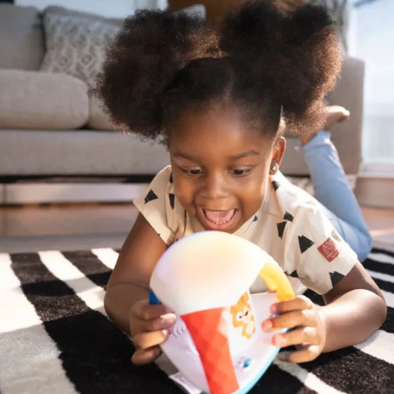 Discovery is prismatic with Baby Einstein’s Curiosity Kaleidoscope™ Electronic Toy. Squeeze the colored handle to see the corresponding hue light up in the kaleidoscope dome. Baby will hear the name of the color as she sees the toy glow! Experiment with color mixing by grabbing two handles at once. A musical soundtrack will keep baby’s attention as she discovers primary and secondary colors through cause and effect learning. Encourage cognitive development through play!