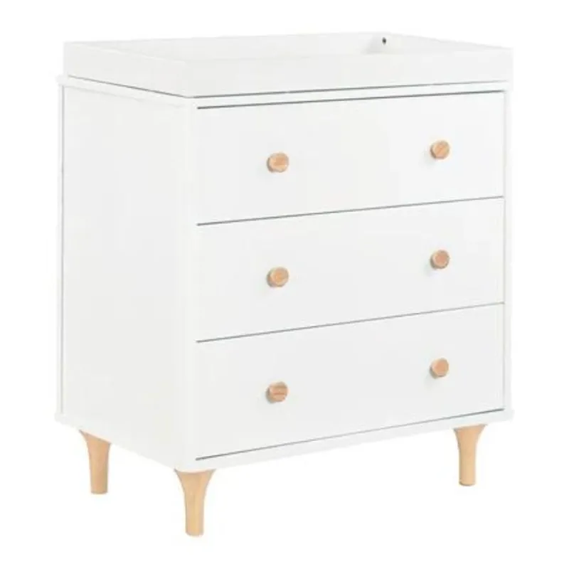 Enjoy the playful modernity of the Babyletto Lolly 3 Drawer Dresser Changer! With natural curves, delicate natural feet, and an included removable changing tray, the Lolly Dresser is a perfect complement to the Lolly 3-in-1 Convertible Crib.