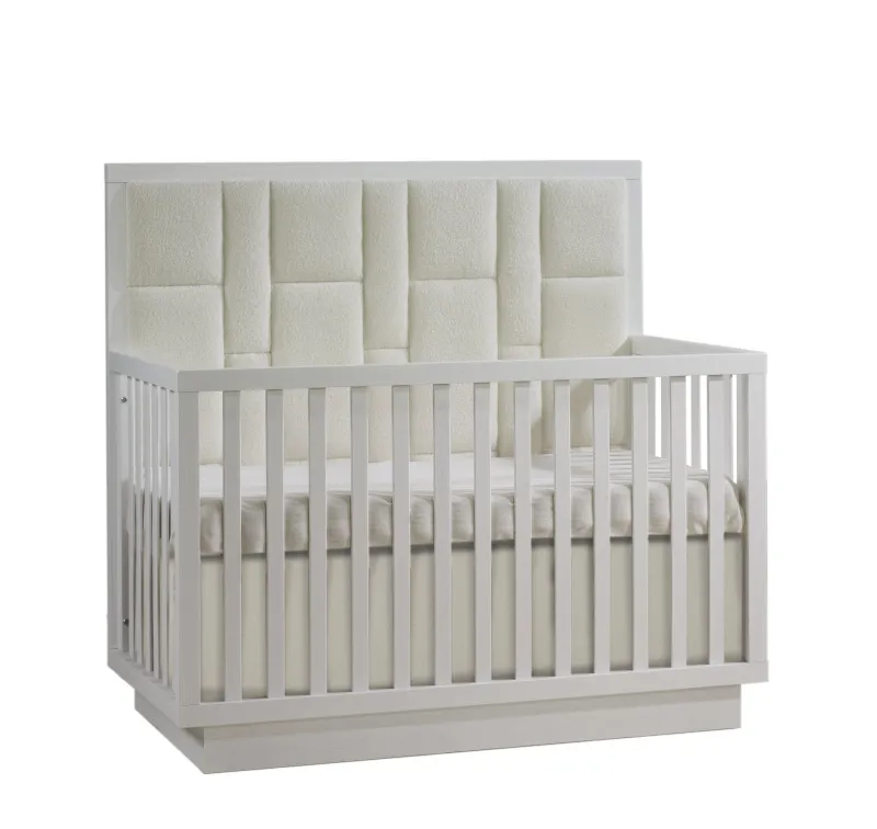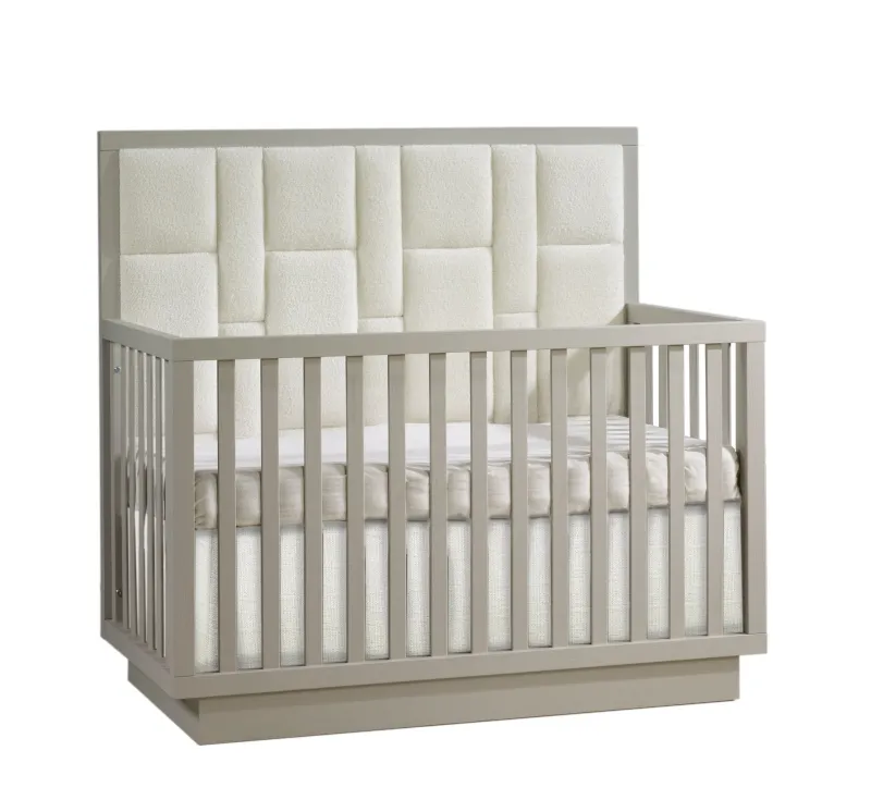 - Convertible crib with a thicker and higher 53’’ headboard with a geometric upholstered panel in Bouclé Beige