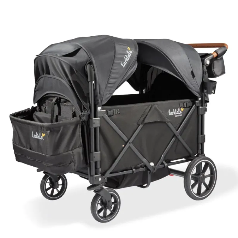 The Larktale Caravan Quad Stroller Wagon offers spacious seating for up to four passengers with multi-position reclining seats, a drop-down footwell, and a reconfigurable harness system for added versatility. With large rubber wheels, all-wheel suspension, ample storage, and adjustable sun canopies, it’s built for smooth maneuverability, comfort, and convenience on any adventure.