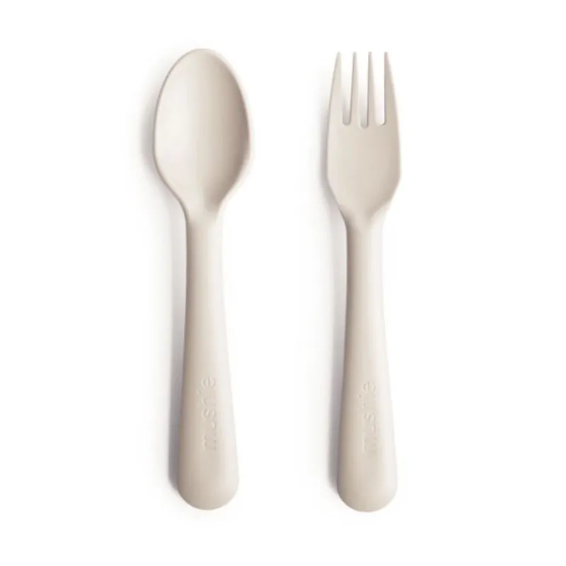 With soft colors and clean design, this flatware fork and spoon set by Mushie is simple and elegant and easy for your toddler and child to hold.