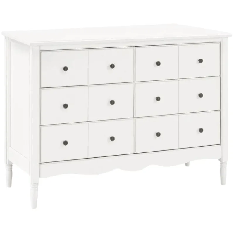 The vintage-inspired Liberty 6-Drawer Dresser from Namesake is an elegant accent piece for any room. With apothecary style drawer fronts, tapered feet and scalloped apron, every detail has been thoughtfully designed. The Liberty dresser also includes two hardware options – vintage gold and vintage iron – to fit your personal aesthetic and to pair with best-selling Liberty, Abigail and Winston cribs.